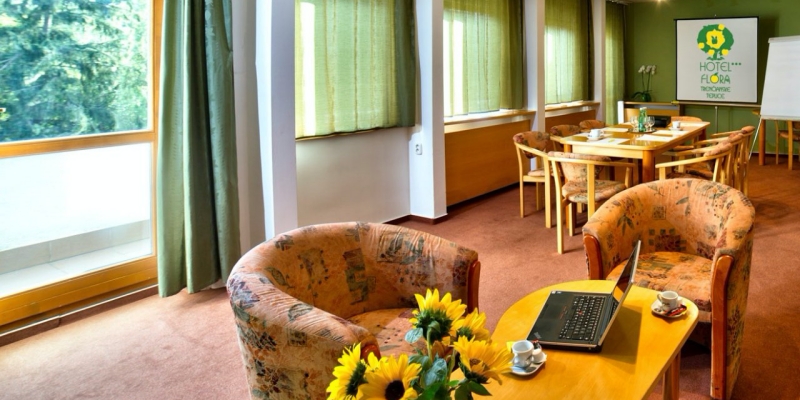Výhodou Hotelu Flóra je možnost využití několika společenských místností. Klimatizovaný konferenční sál nabízí divadelní sezení pro 70 osob a disponuje kompletním školicím vybavením. Salonek má sezení ve tvaru písmene O a je určen pro 20 osob. Na přání je možné zajistit stejné technické vybavení v salonku jako v Konferenčním sále. Jedná se o promítací plátno s ozvučením, dataprojektor, zpětný projektor, DVD, CD a videorekordér, flipchart a DSL připojení k internetu.