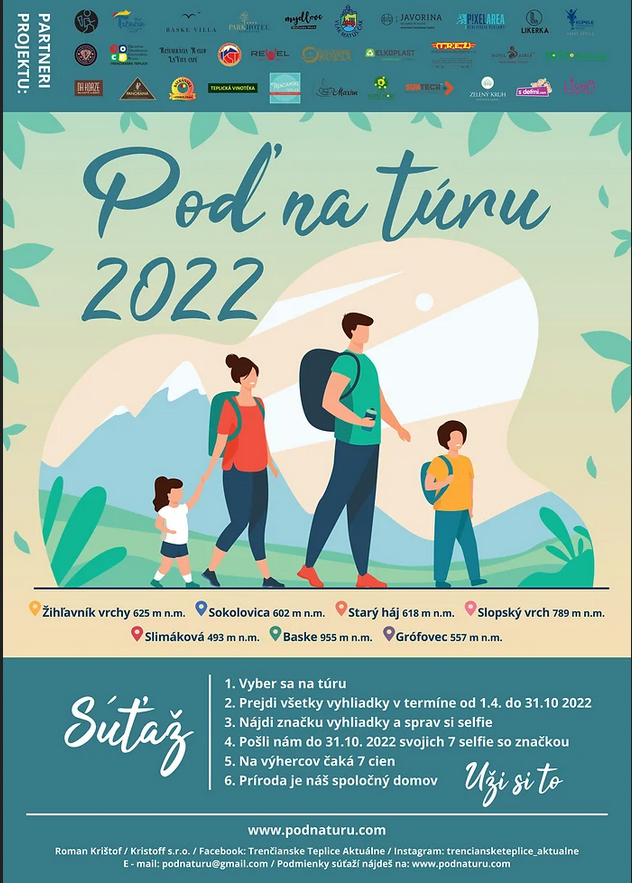 Organizátoři akce Pojďte na túru 2022 stejně jako v loňském roce stanovili 7 vyhlídek nacházejících se v blízkosti Trenčianských Teplic. Vrcholy Slimáková, Grófovec, Sokolovica, Starý háj, Slopský vrch, Baškí a Žihlevník představují 7 výzev, které bylo třeba překonat. Podmínkou soutěže bylo vyfotit se na každém z vrcholů, a to u vyhlídkové cedule. Selfie fotografie měl do soutěže zaslat každý účastník k podnaturu@gmail.com. Mezi hlavní lákadla soutěže patří 7 cen, mezi nimiž je několik víkendové pobyty v Trenčianských Teplicích.